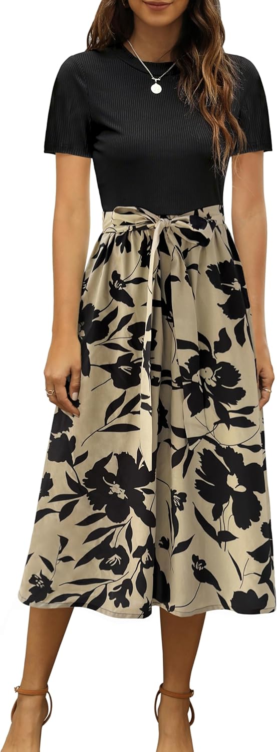 Zattcas Women 2025 Summer Dress Short Sleeve Ribbed Teacher Church Modest Business Casual Work Outfits Midi Dress